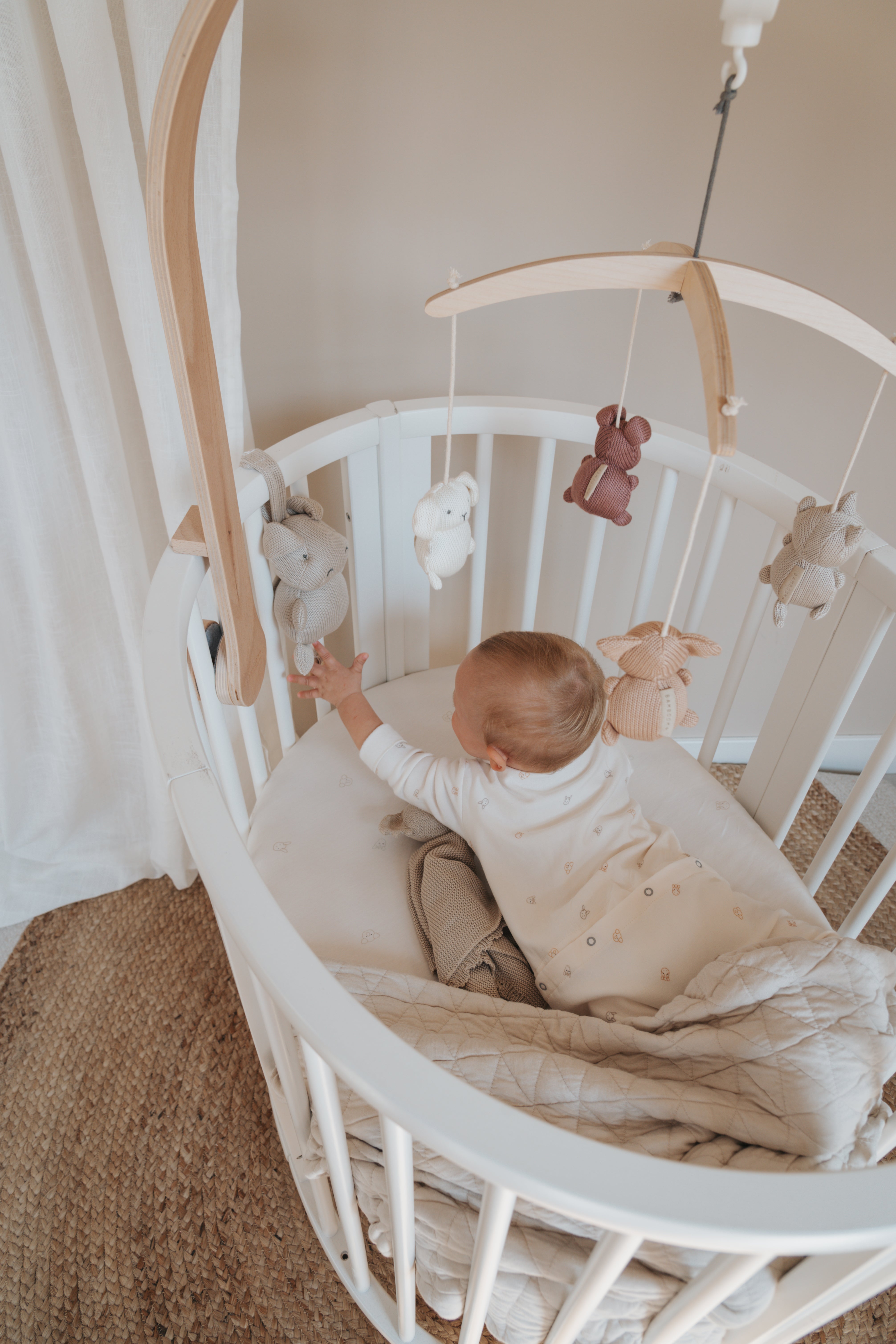 - Natürliches Holzkarussell , das sich bewegt und über einen Musikmechanismus mit Schlafliedern verfügt