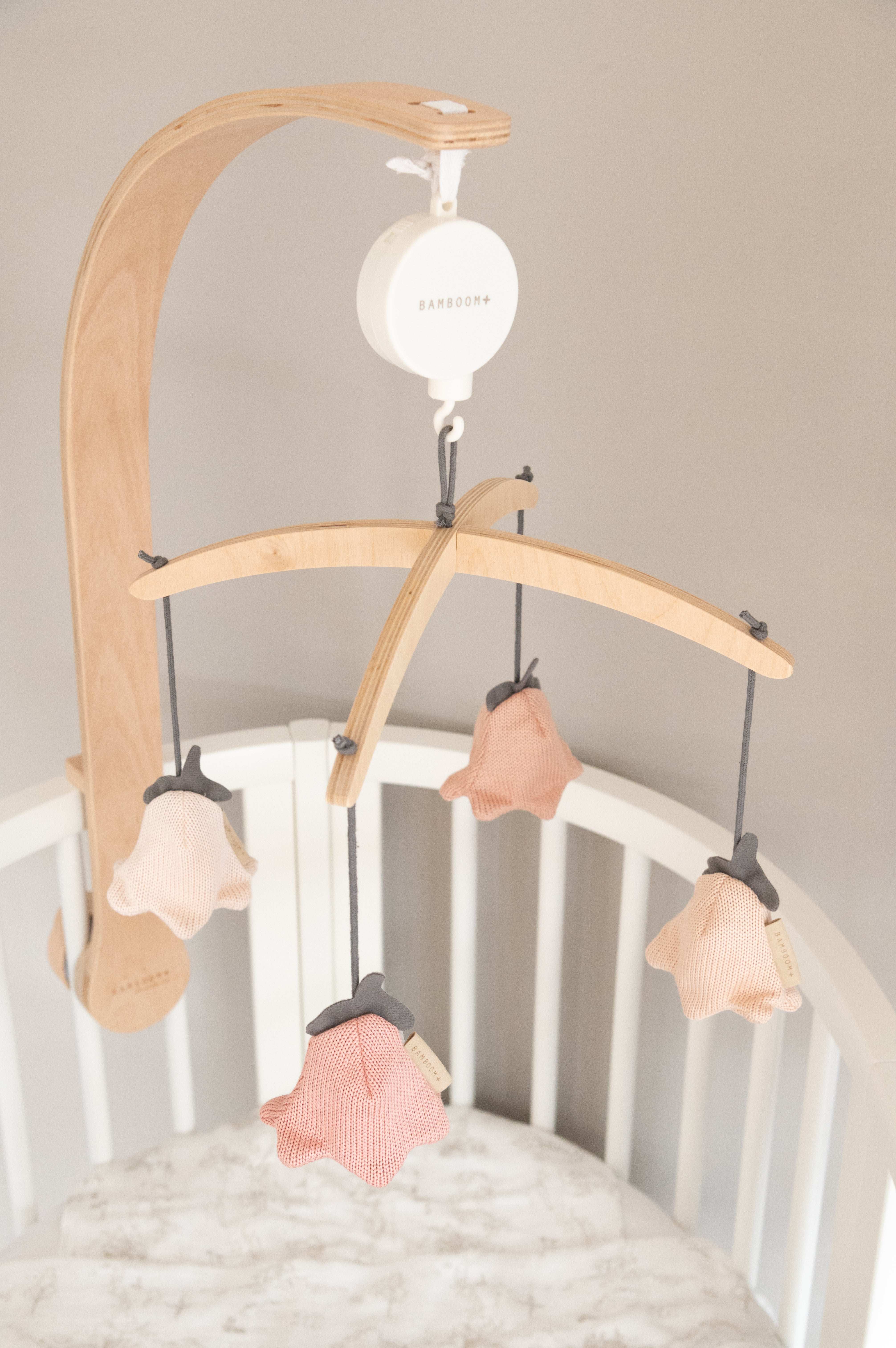 Make bedtime magical with the Bamboom mobile in natural wood with hanging sweet forest animals in natural knit. These animals are colorful and soft, made in neutral colors and move to the rhythm of music thanks to the wooden mobile, ideal for making your child's bedroom an even more welcoming place.