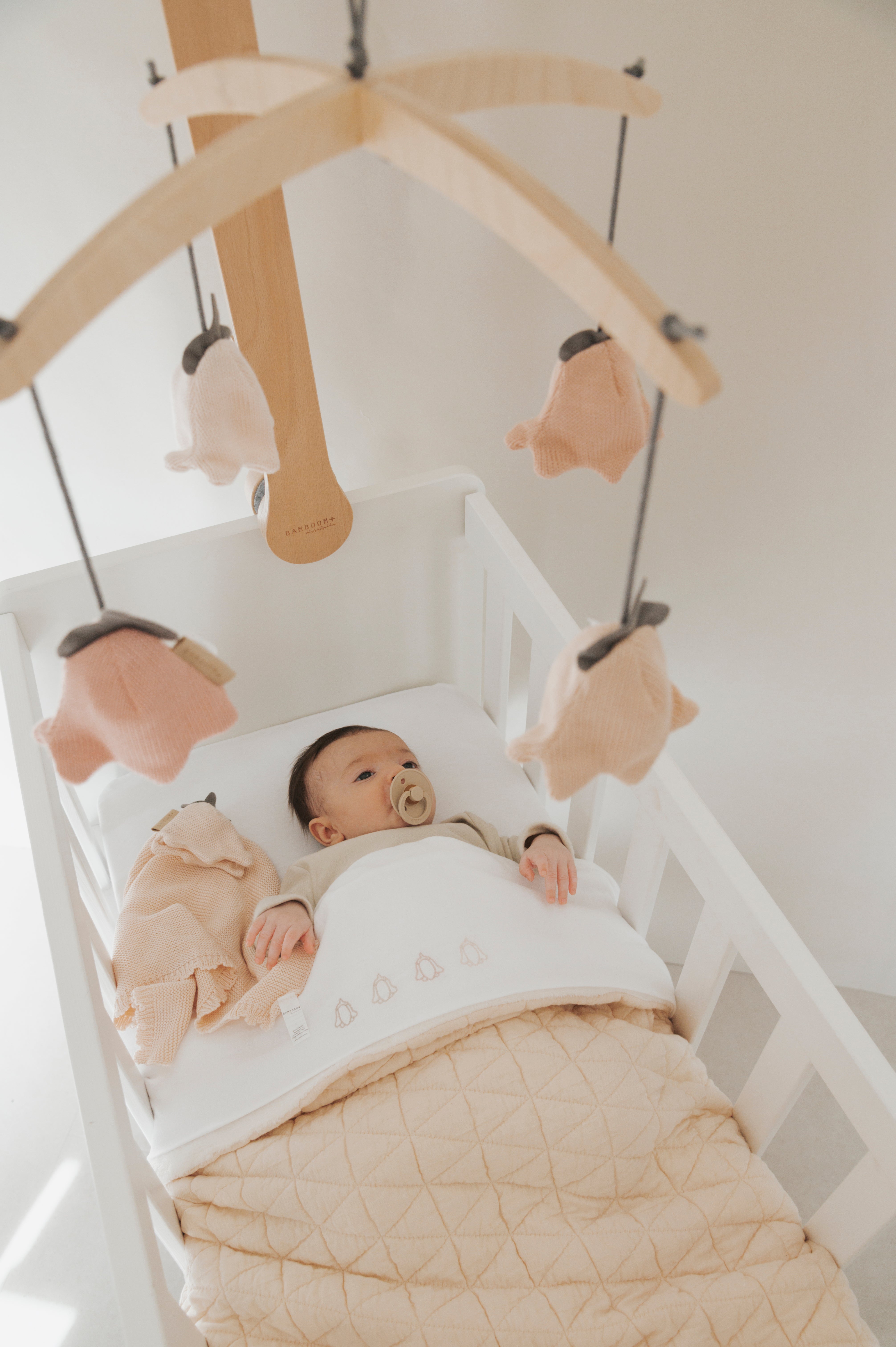 - Natuurlijke houten draaimolen die beweegt en voorzien is van een muziekmechanisme met slaapliedjes
