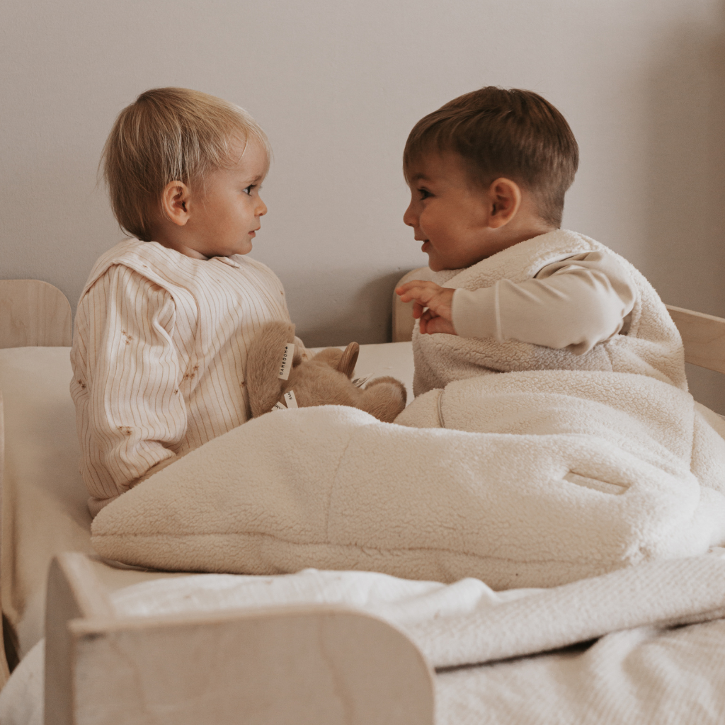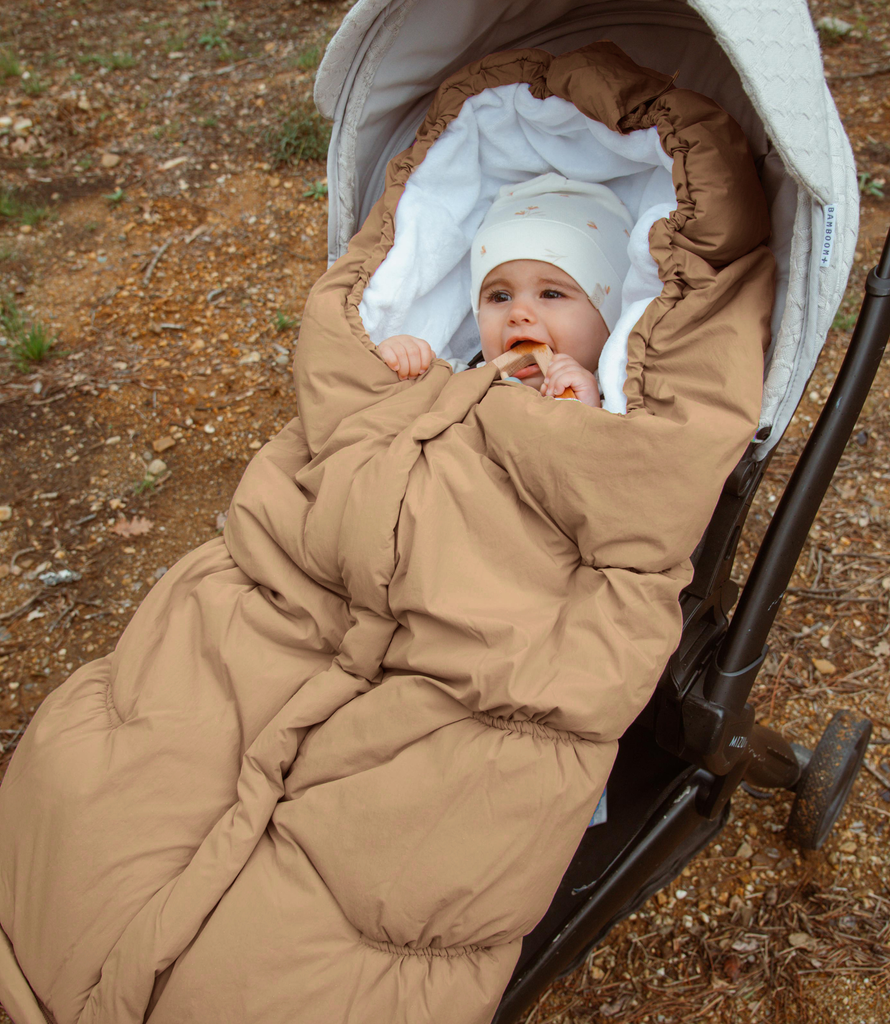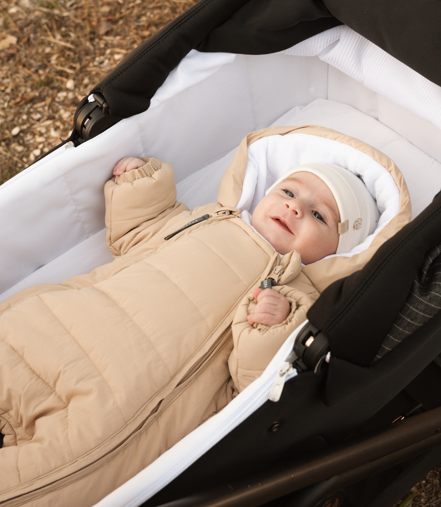 I sacchi Igloo e le tute da neve sono realizzati con interno in velluto di bambù – morbido, traspirante e delicato sulla pelle – e esterno in poliestere riciclato, resistente a pioggia e vento, uniscono performance tecniche e sostenibilità.