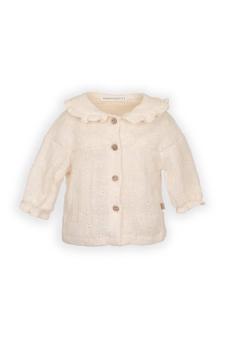 Delicata, romantica e pratica: la blusa con colletto volant è perfetta per arricchire il guardaroba delle più piccole con uno stile elegante ma comodo. Il colletto arricciato, i bottoni frontali e le maniche con elastico al polso aggiungono dettagli raffinati a un capo pensato per essere indossato ogni giorno. Realizzata in tessuto ricamato di origine naturale, derivato da fibre di bambù e cotone, è morbida, traspirante e rispettosa della pelle sensibile dei neonati e delle bambine fino a 3 anni. Il colore Warm White la rende facile da abbinare a qualsiasi fondo, rendendola ideale per cerimonie, occasioni speciali o semplicemente per sentirsi belle ogni giorno. Un capo di qualità, pensato per durare e per essere tramandato nel tempo.