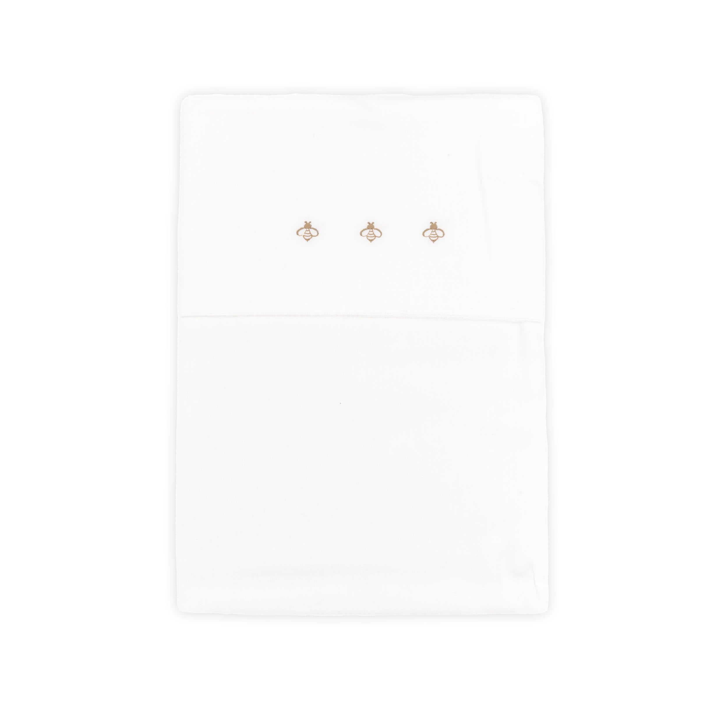 Il design semplice e raffinato è impreziosito dal ricamo con tre apine, simbolo di dolcezza e attenzione alla natura, rendendo il lenzuolino un complemento essenziale per il corredino del bambino.
