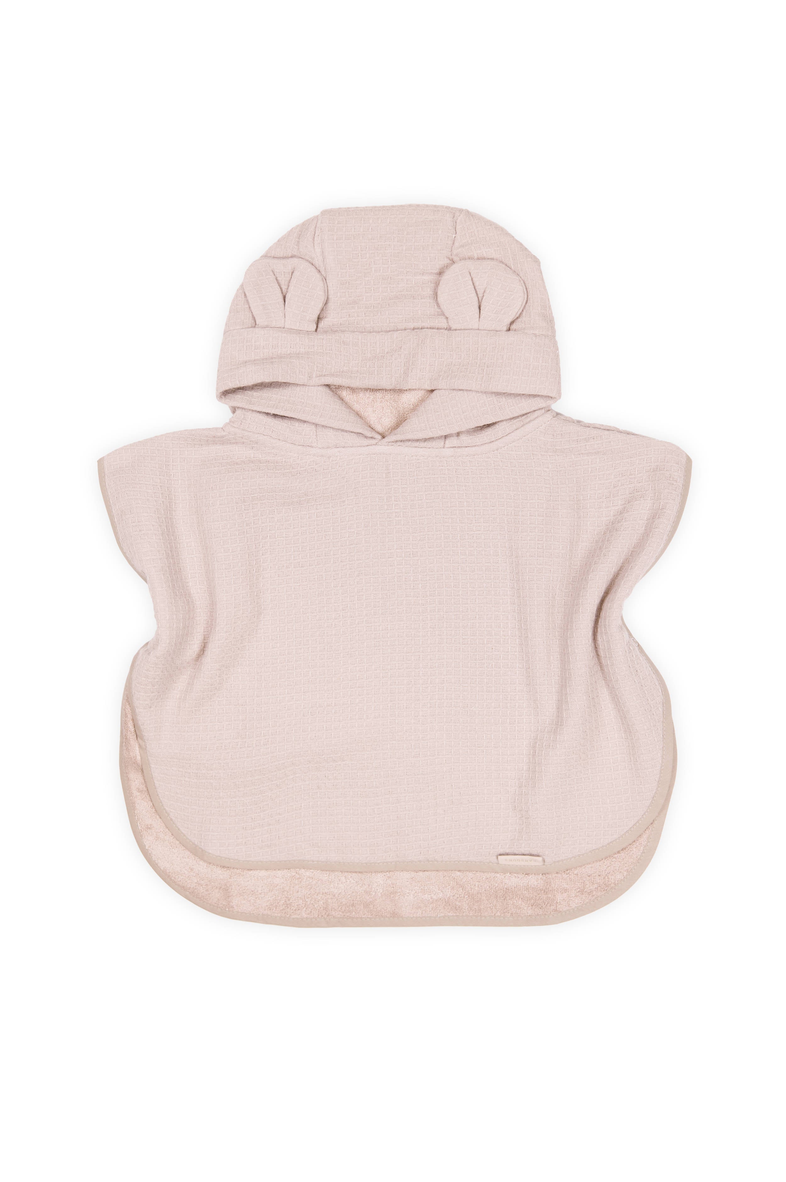 Realizzato con tessuti di origine naturale, combina la praticità della spugna assorbente alla piacevole texture del waffle, perfetta per facilitare l’asciugatura. Il cappuccio con orecchie aggiunge un dettaglio giocoso, mentre il taglio ampio lo rende comodo da indossare anche sui vestiti.